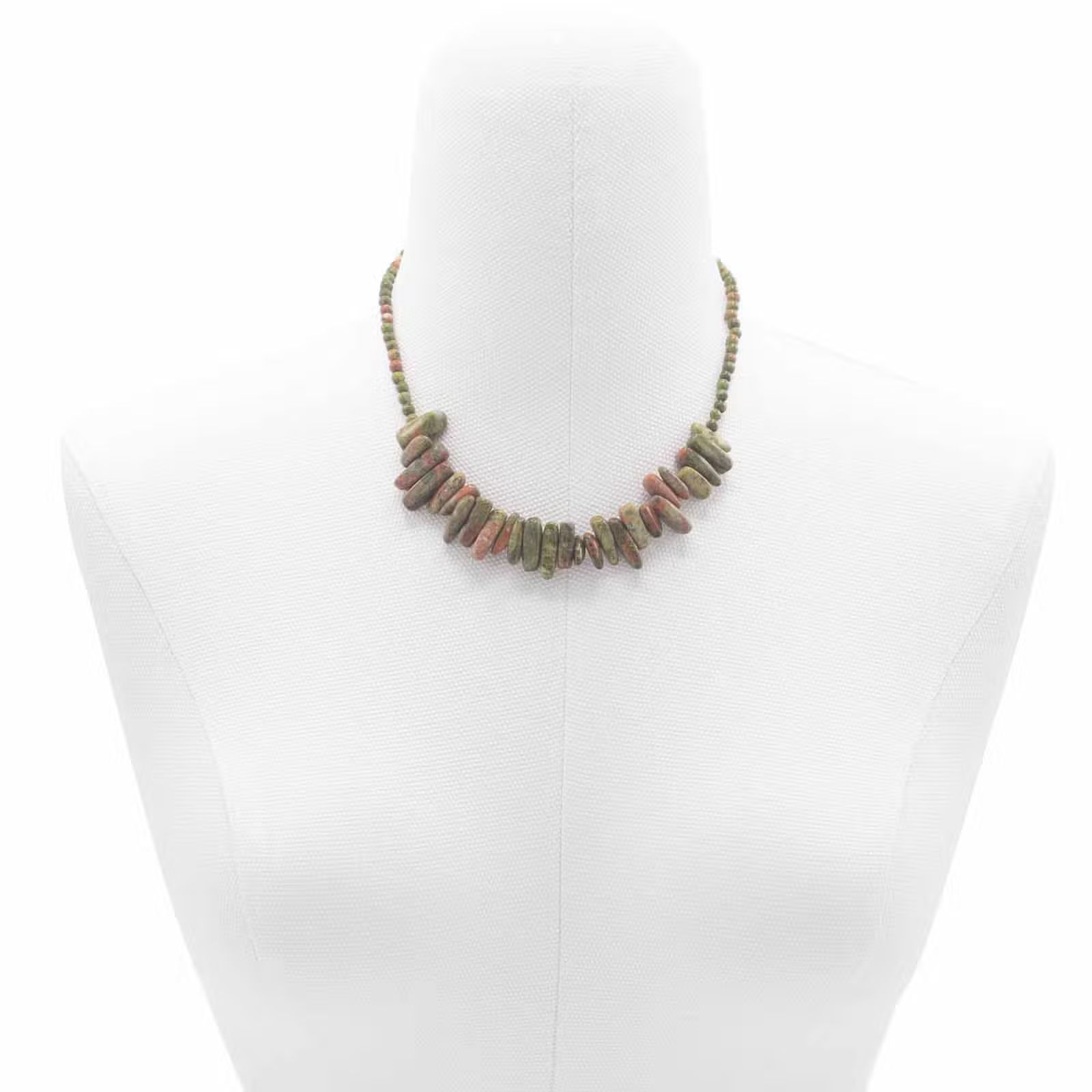Vackert halsband med långa ädelstenar Unakit som har en fin harmonisk lyster. Material: Gemstones, mått 44 x 1 cm.